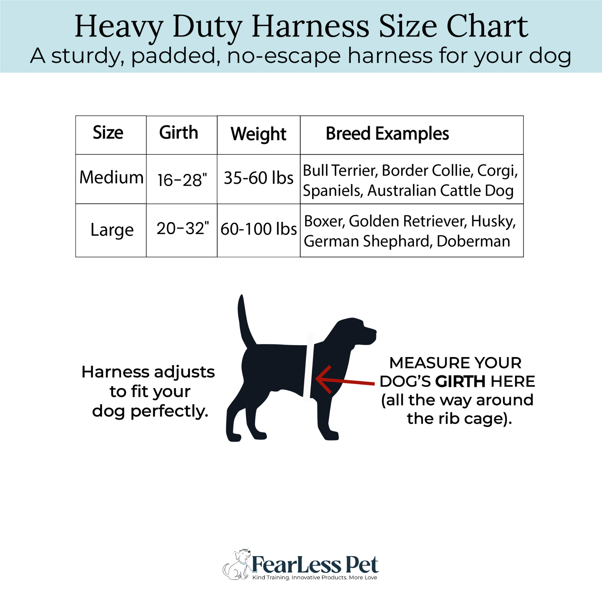 - Large fits dogs between 60 and 100 lbs. (20 to 32" girth)