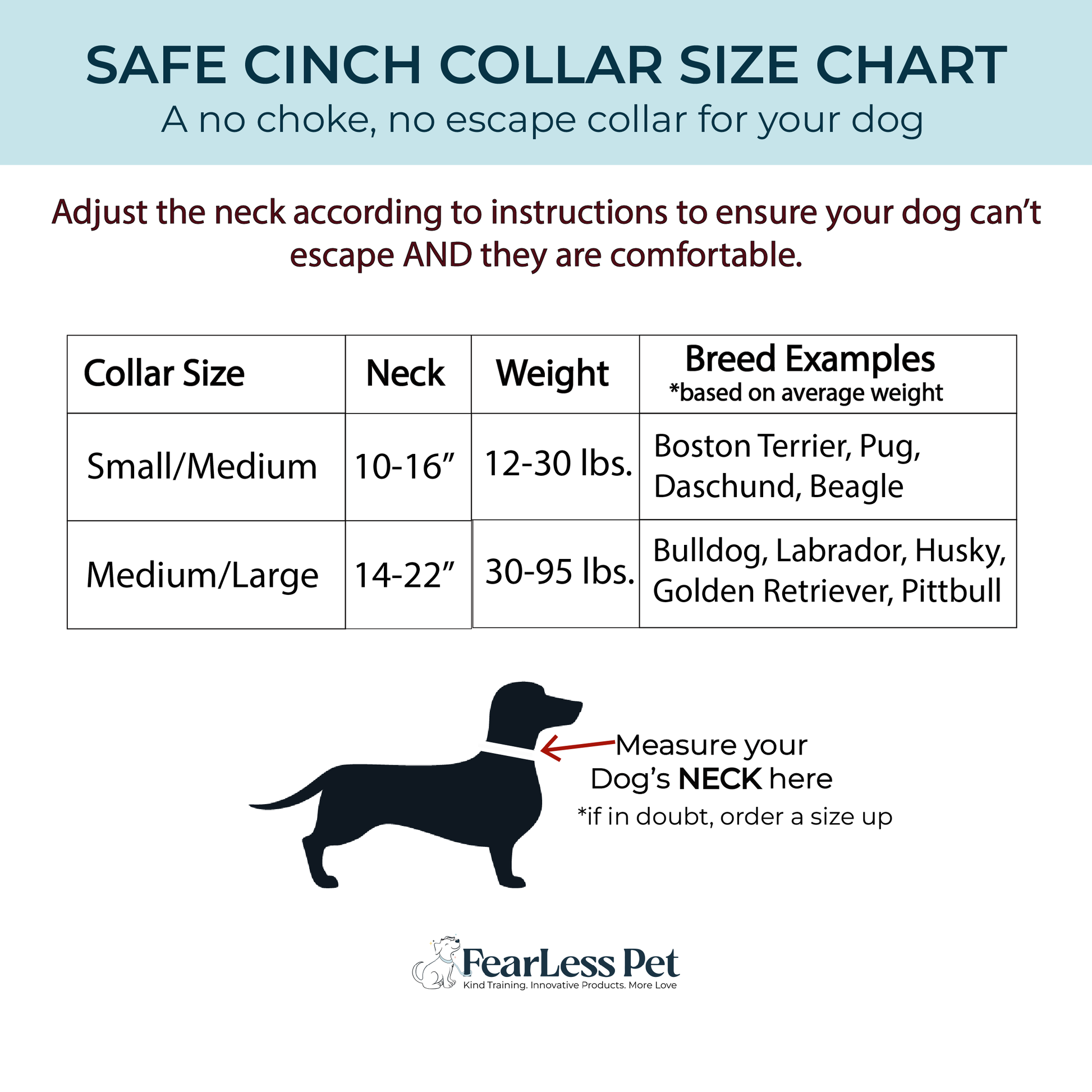 The Safe Cinch® no escape dog collar is the perfect balance of style and safety, giving you and your pup peace of mind on all your adventures. The patented cinch has been thoughtfully designed to make this escape proof dog collar the most gentle one on the market. Bye bye, choke chains and martingale styles...hello, Safe Cinch!